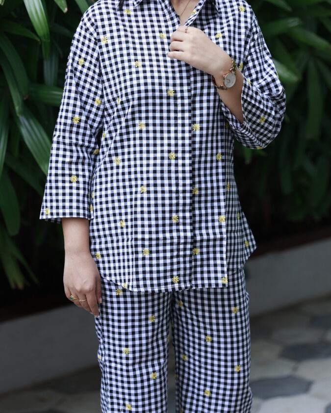 ChessaBloom – Black & White Checks with Yellow Flower Co-Ord Set for Women