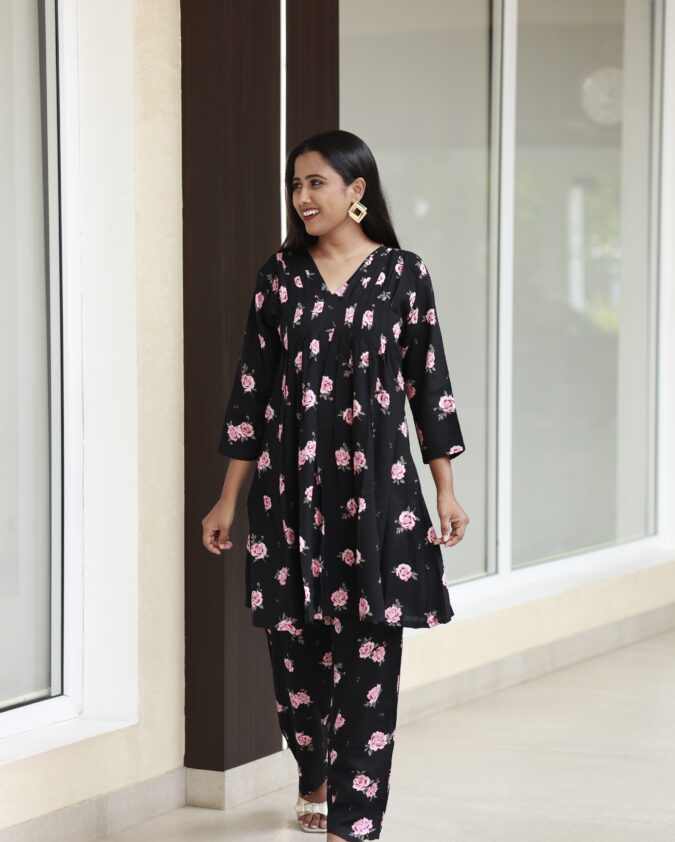 RosaVelin – Reyan Black with Rose Flower Print Co-Ord Set for Women