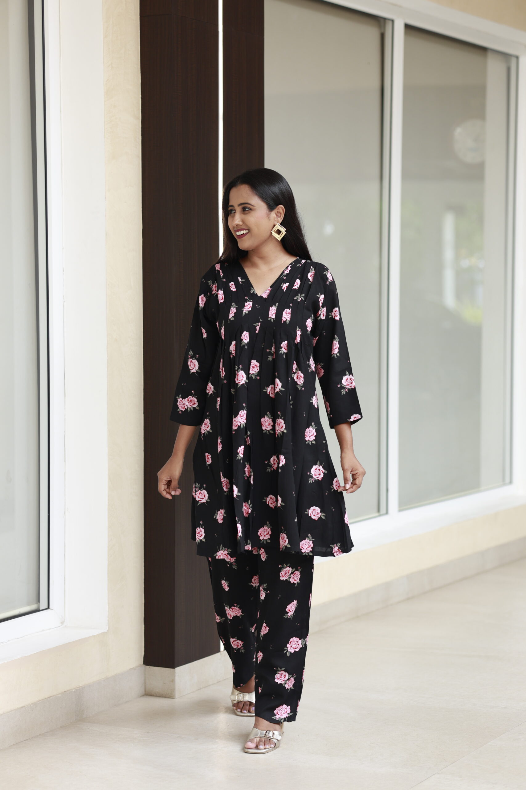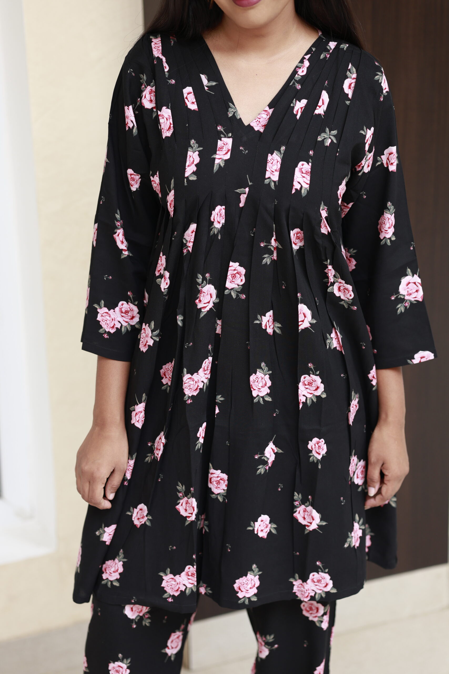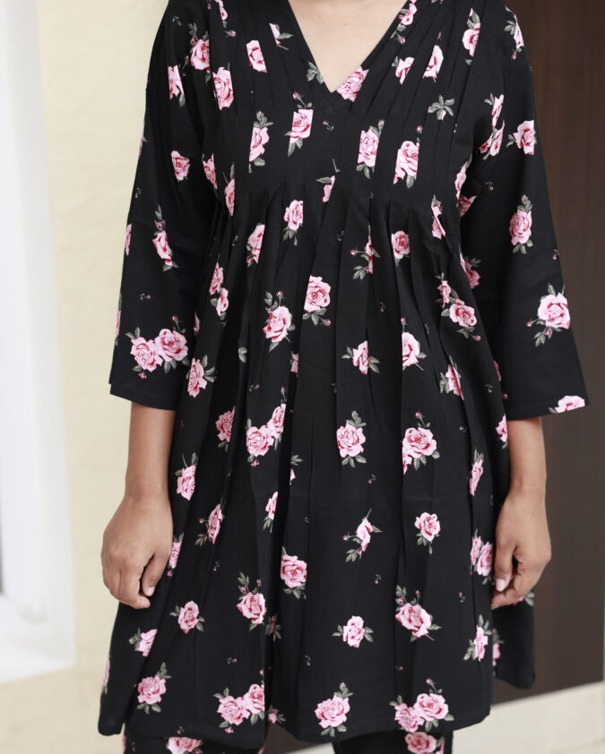 Soft, flowing, and quietly bold — RosaVelin is crafted from premium reyon fabric, offering a perfect mix of comfort, elegance, and effortless style. The rich black base beautifully highlights the rose flower prints, creating a timeless look that exudes modern femininity.