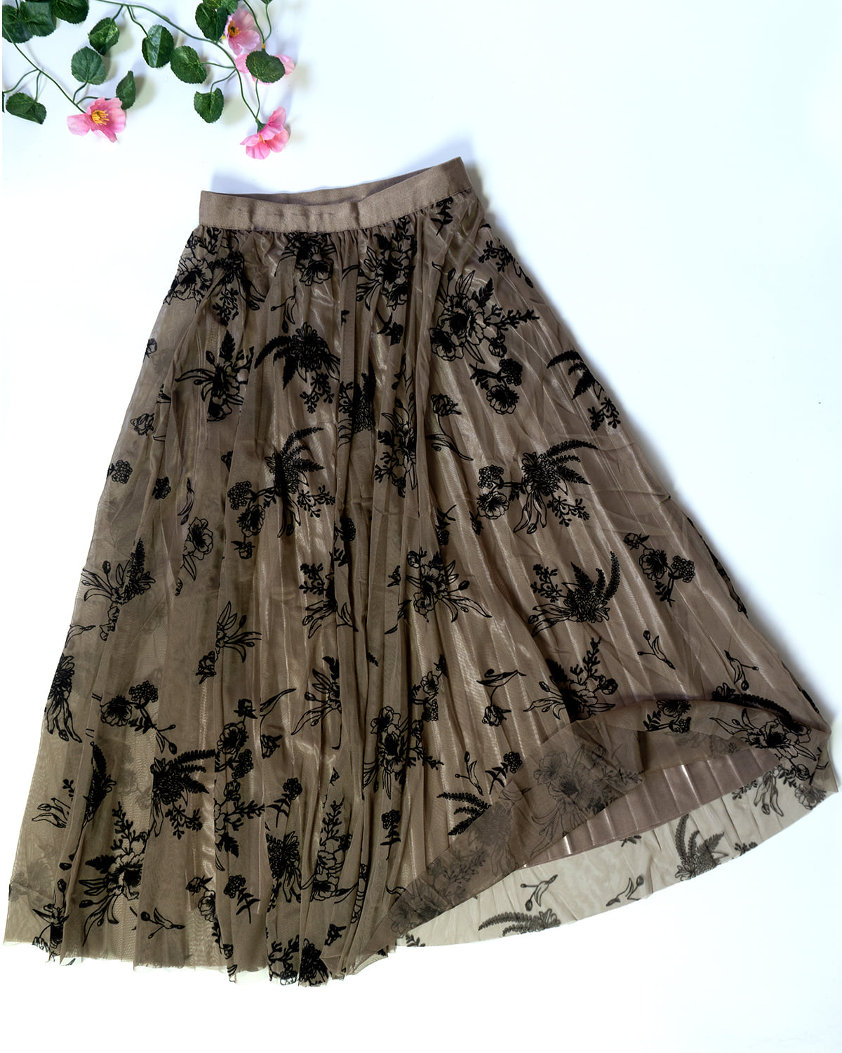 Add the Tarini – Netted Brown with Big Black Floral Skirt to your wardrobe for style, comfort, and timeless femininity.