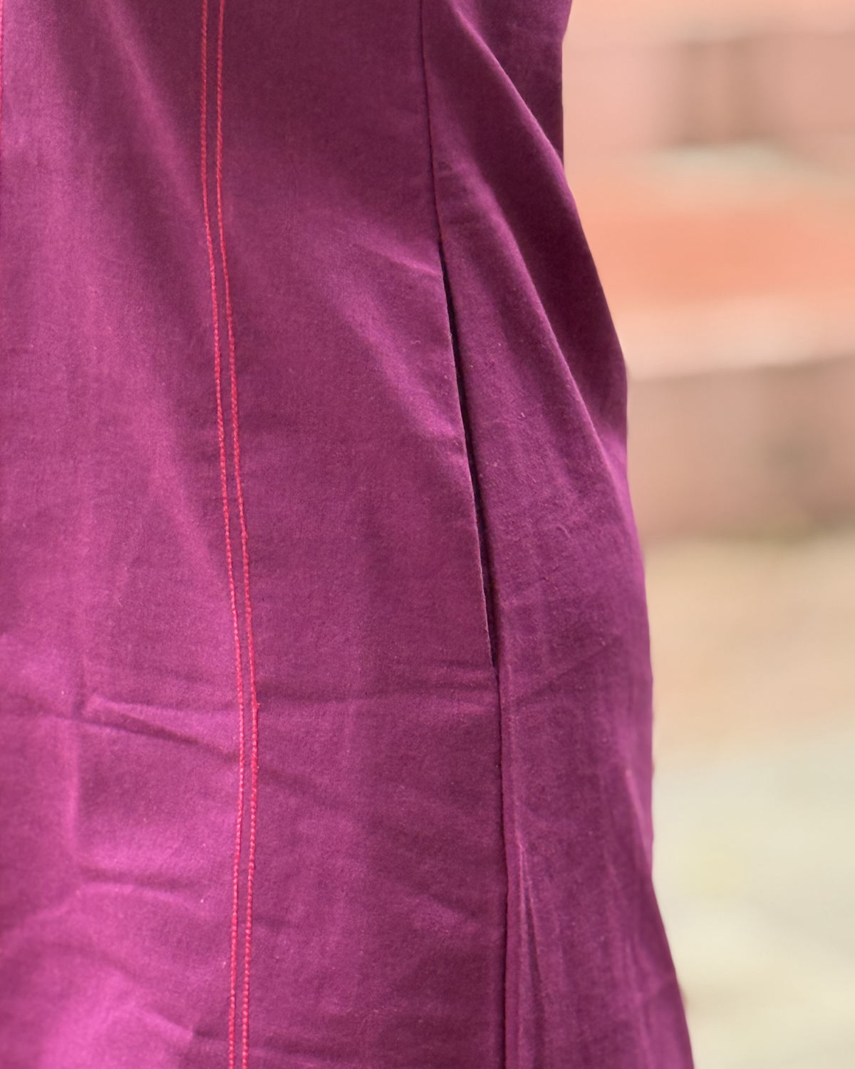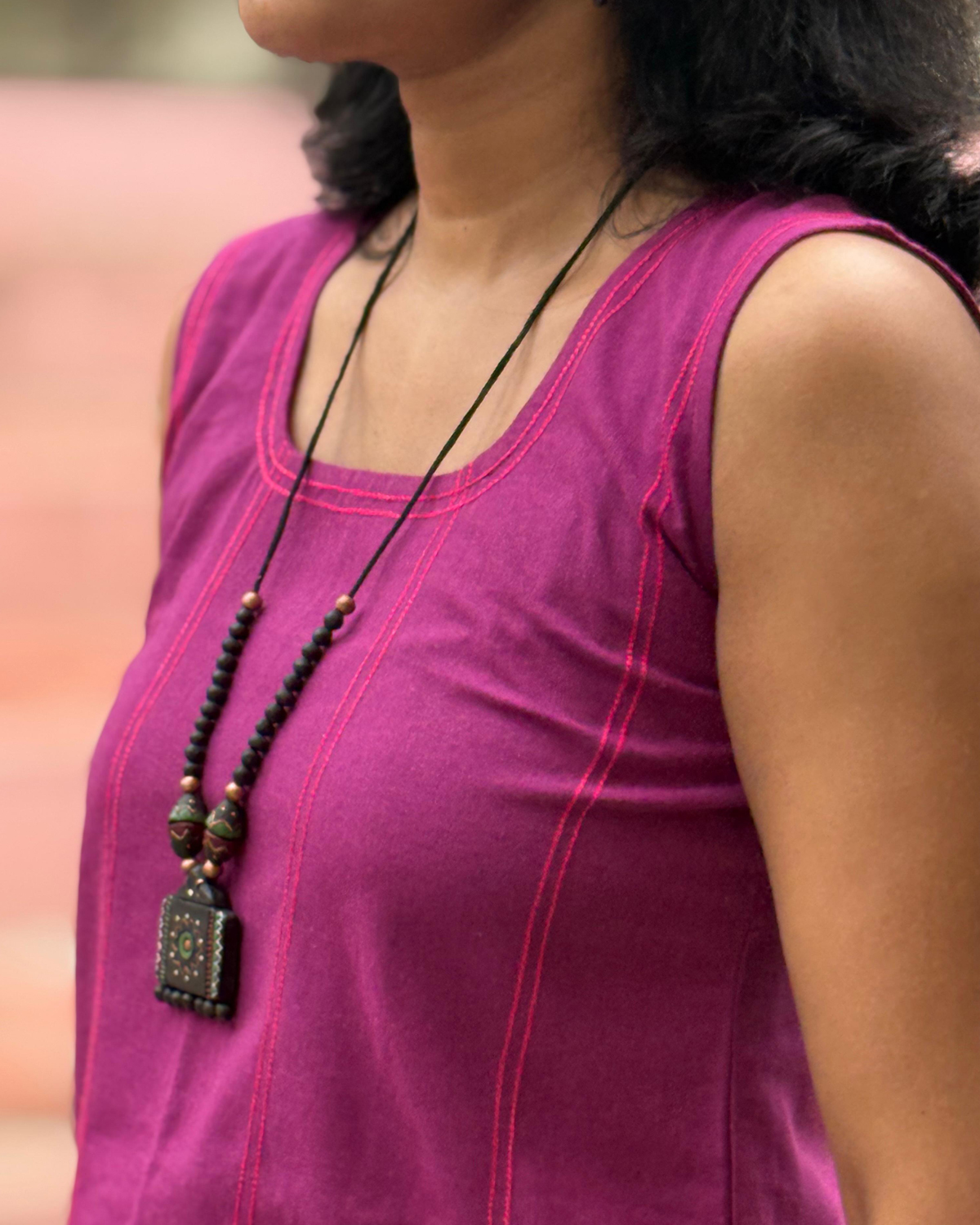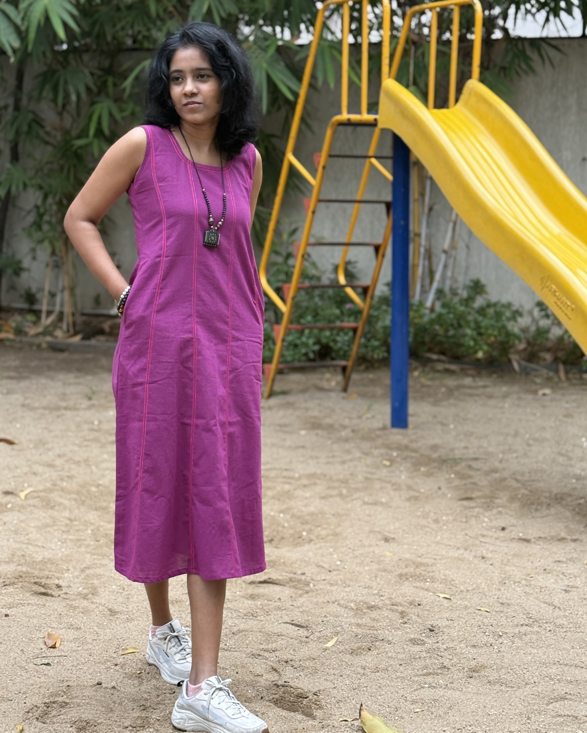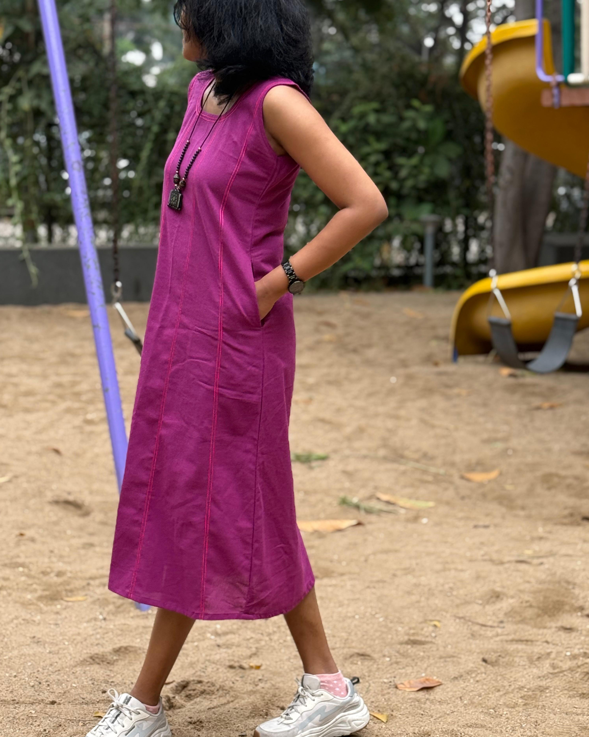 Crafted from recycled cotton, Ziva is soft, breathable, and kind to the planet. The round neckline and sleeveless design keep it simple and versatile, while rose or purple contrast thread detailing adds a subtle, elegant touch. With two functional side pockets, this dress combines style and practicality seamlessly — perfect for casual days, relaxed outings, or work-from-home hours.
